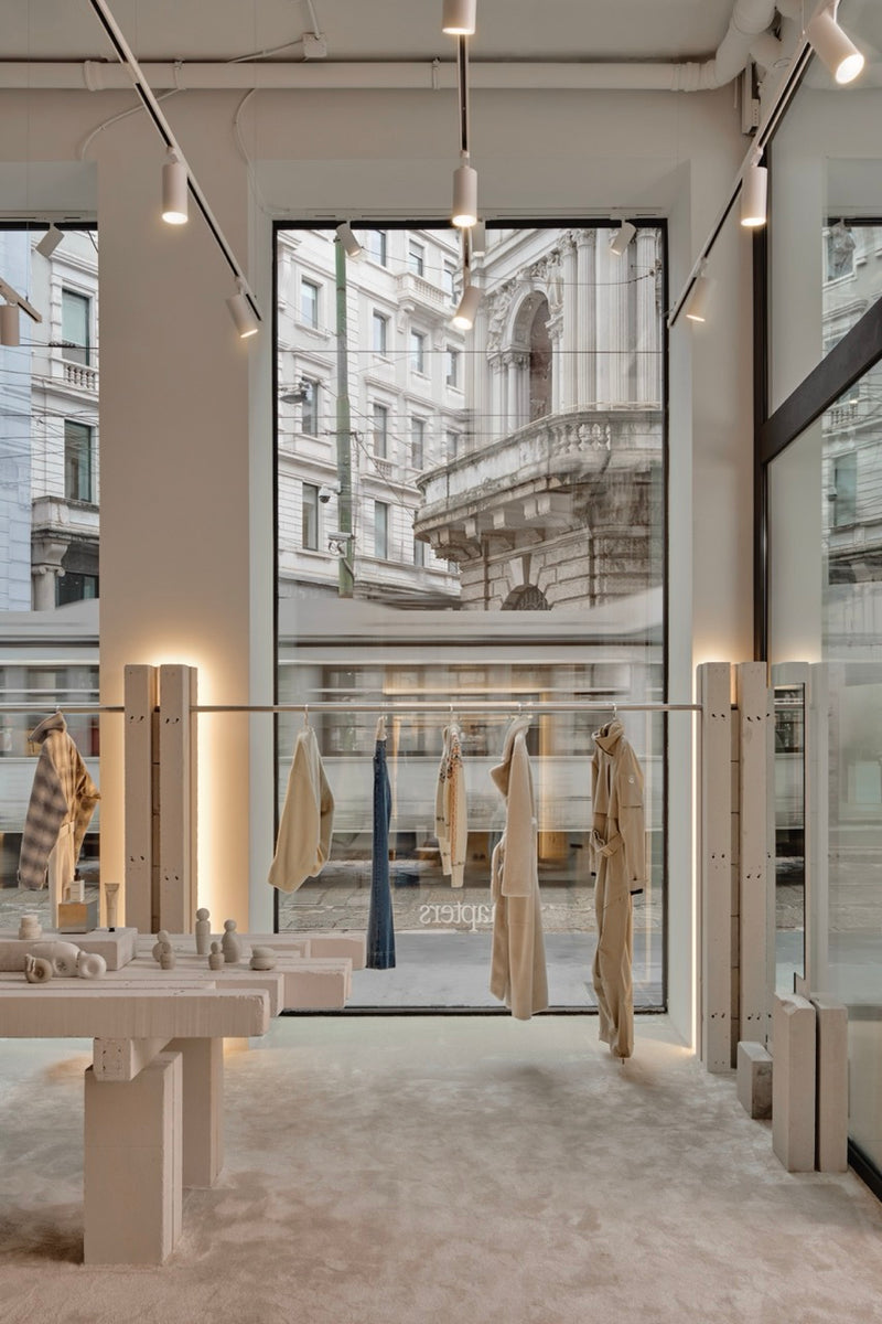 An open store facing the city The store unfolds across two levels, offering a generous and airy layout, with eight large windows facing the street, creating a visual continuity between interior and exterior. The windows are not merely display elements — they tell a story. They evolve with the seasons, shaping a recognizable aesthetic within the urban landscape.The concept goes beyond that of a traditional store; it is a space meant to be inhabited.
