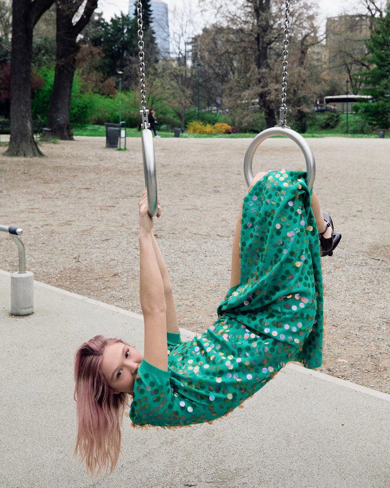 Still grounded in Milan, but seen through a new lens, Vitaminic reimagines the city as a space of contrast and play. Between the quiet greens of Milan’s parks and the architectural rhythm of its streets, the setting becomes softer, more fluid — almost suspended in a soft spring haze.